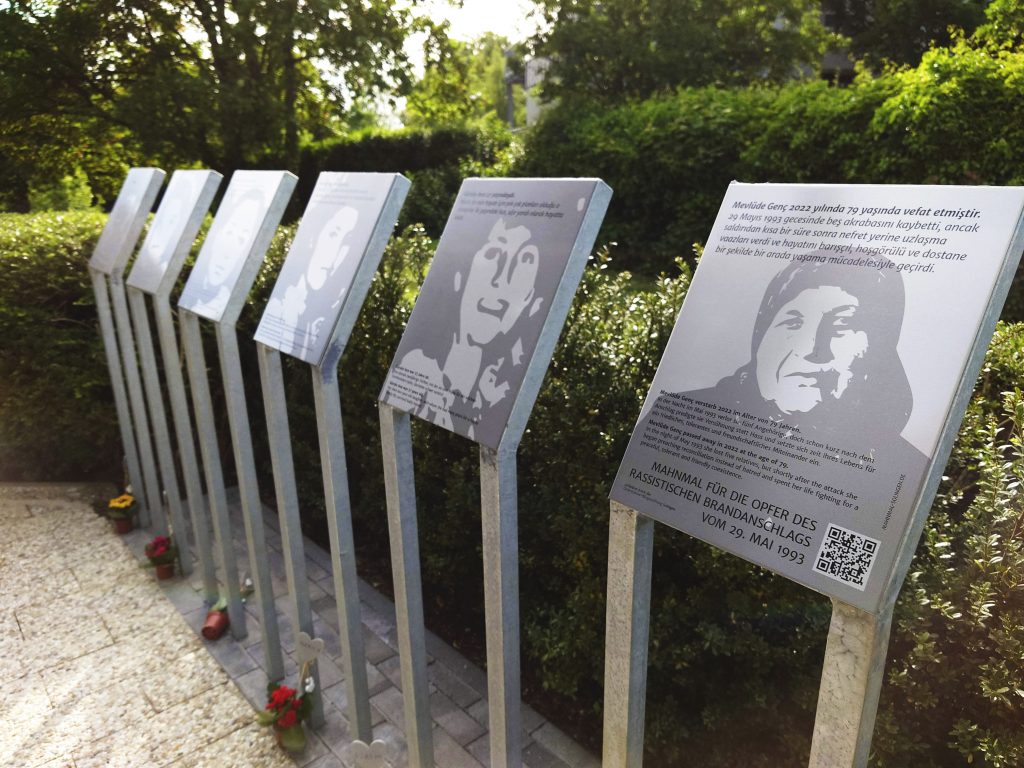 Die Stadt Solingen und der Verein „SOS Rassismus“ wollten, dass man in der Unteren Wernerstraße 5 Bäume pflanzt. Das haben sie im Jahr 1994 gemacht. Seit 1994 gibt es auch einen Gedenkstein. Er erinnert an die 5 Ermordeten. Seit dem Jahr 2023 gibt es auch ein Schild mit Infos. Auf dem Schild sieht man das Haus von der Familie Genç.